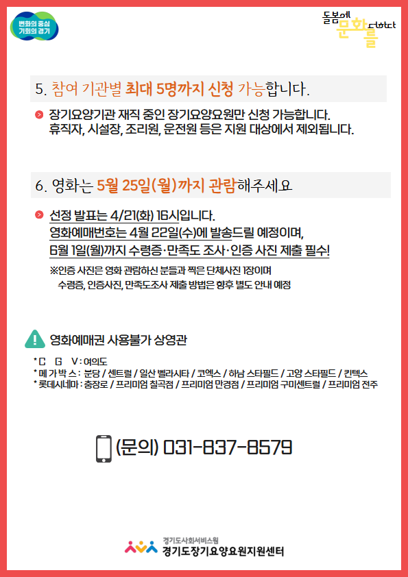 ◎ 문화지원(영화관람 예매권) 신청은 개인이 아닌 단체(기관별) 접수로 진행됩니다