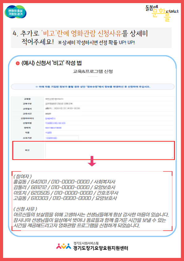 ◎ 신청 시 꼭!! '비고' 칸에 참여자 정보(이름, 생년월일, 직종, 연락처) 및 신청사유를 적어주세요