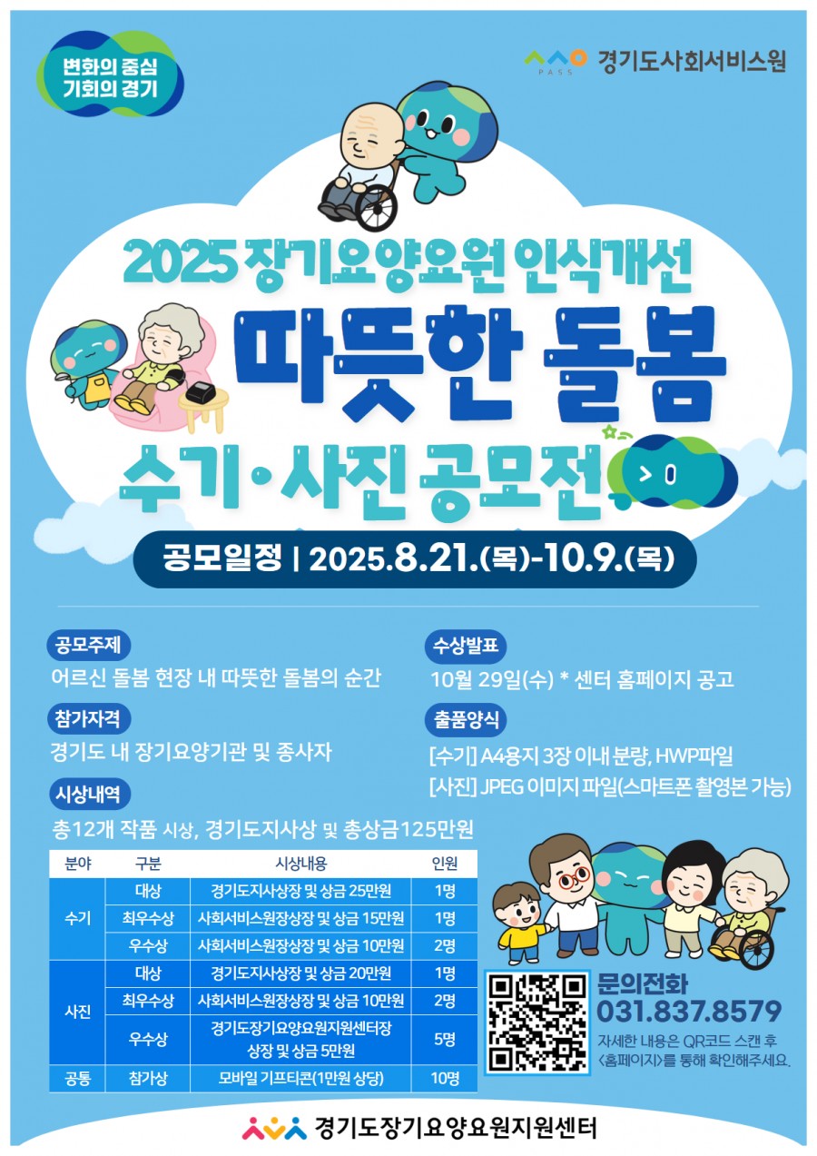 경기도 장기요양요원 처우개선 조례에 의해 설립된 경기도장기요양요원지원센터는 어르신 돌봄 현장 내 서로 배려하고 존중하는 따뜻한 돌봄 문화를 확산시키기 위하여 「2025 장기요양요원 인식개선 따뜻한 돌봄 수기·사진 공모전」을 개최하오니 많은 관심과 참여 바랍니다.