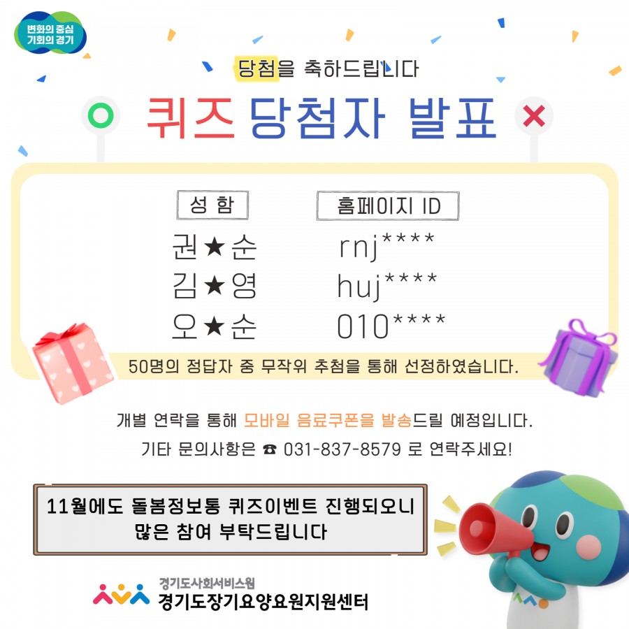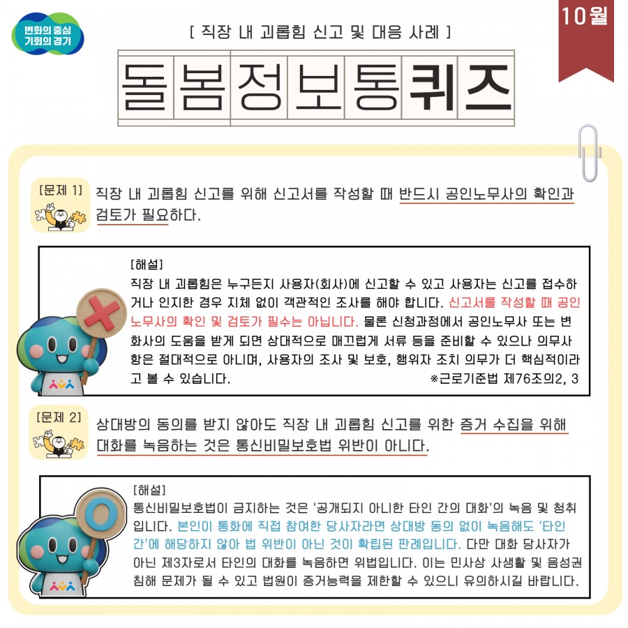[안내] 10월 돌봄정보통 퀴즈이벤트 정답 및 당첨자 발표 페이지 정보 공지 작성자 센터관리자 조회 124회 작성일 2025-10-27 09:15 목록 본문 「돌봄 현장 속 직장 내 괴롭힘 신고 및 대응사례」 내용 바로가기▼ ▽ ▼ ▽ ▼ ▽ ▼ ▽ ▼ ▽ ▼ ▽https://ggscw.or.kr/s5_4/111 이전글[안내] 2025년 장기요양요원 인식개선 수기·사진 공모전 당첨자 발표 25.10.29 다음글[안내] 11월 장기요양요원 교육 일정 안내 25.10.23