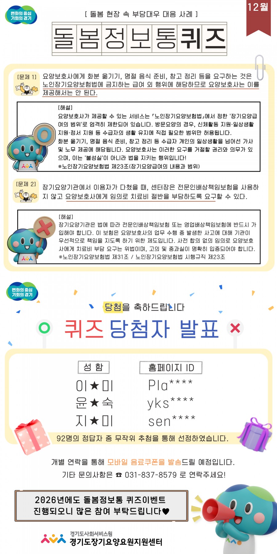 [안내] 12월 돌봄정보통 퀴즈이벤트 정답 및 당첨자 발표 페이지 정보 공지 작성자 센터관리자 조회 10회 작성일 2025-12-15 10:33 목록 본문 「돌봄 현장 속 부당대우 대응 사례」 내용 바로가기▼ ▽ ▼ ▽ ▼ ▽ ▼ ▽ ▼ ▽ ▼ ▽https://ggscw.or.kr/s5_4/113 다음글[공지] 2025년 장기요양요원 인식개선 공모전 작품집 발간 안내 25.12.11