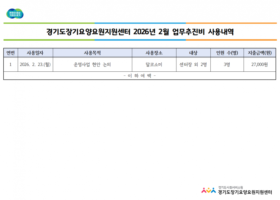 경기도장기요양요원센터 2026년 2월 업무추진비 집행내역을 위와 같이 공개합니다.