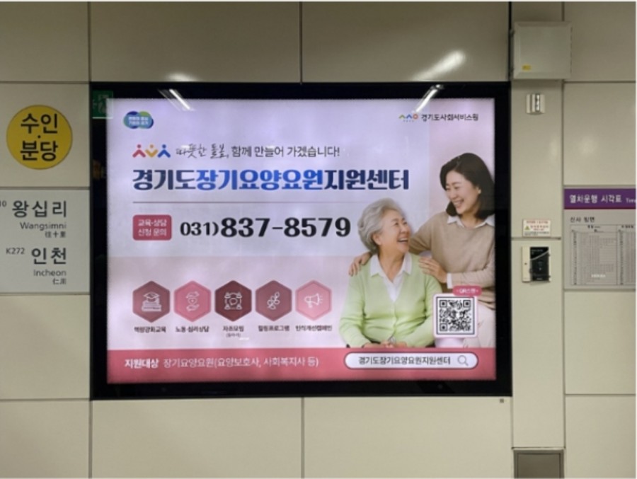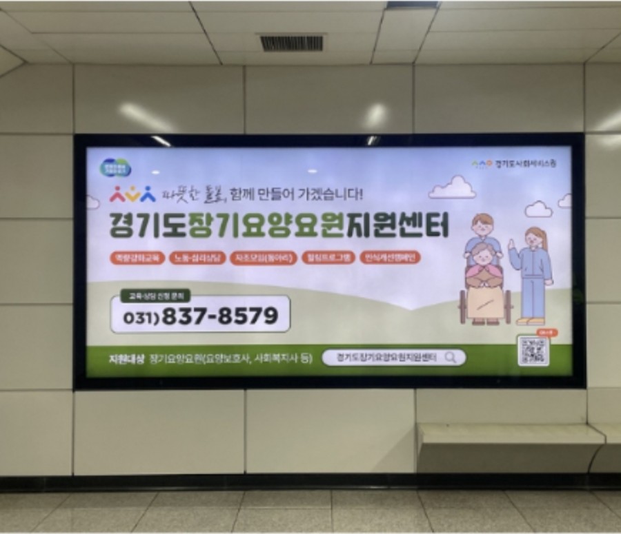 용인시와 성남시 주요 역사 내 전광판 매체를 활용하여 센터 소개 및 주요 지원사업 안내 내용을 게시했습니다.