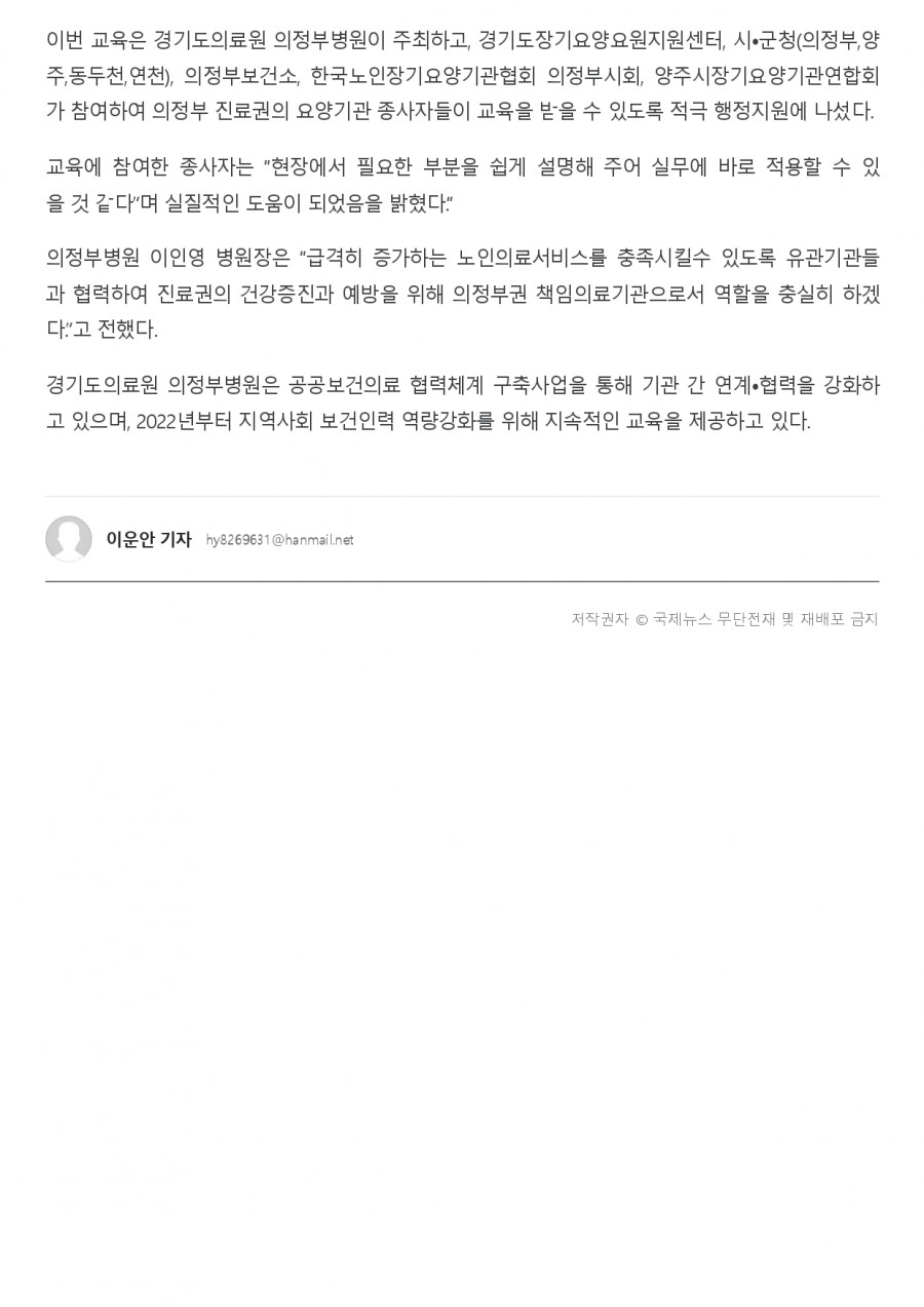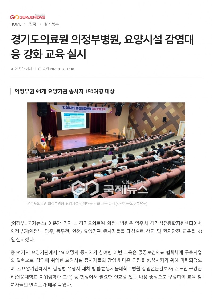 [국제뉴스] 경기도의료원 의정부병원, 요양시설 감염대응 강화 교육 실시 페이지 정보 작성자 센터관리자 조회 28회 작성일 2025-12-29 11:28 목록 본문 [국제뉴스] 경기도의료원 의정부병원, 요양시설 감염대응 강화 교육 실시 이전글[서울뉴스통신] 경기도사회서비스원, 경기도장기요양요원지원센터, 경기도의료원과 협력하여 찾아가는 감염 예방관리 교육 실시 25.12.29 다음글[내외뉴스통신] 경기도사회서비스원 경기도장기요양요원지원센터, 장기요양요원 역량강화 교육 교재 개발 24.12.24