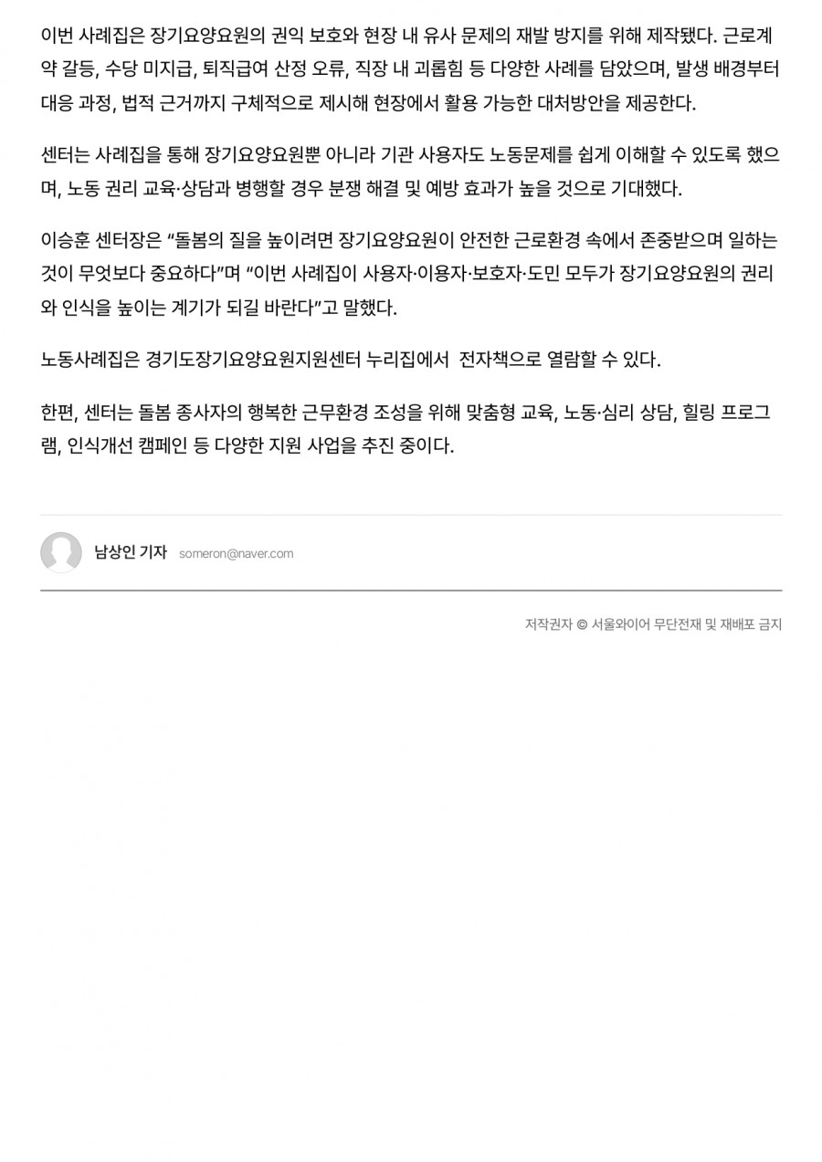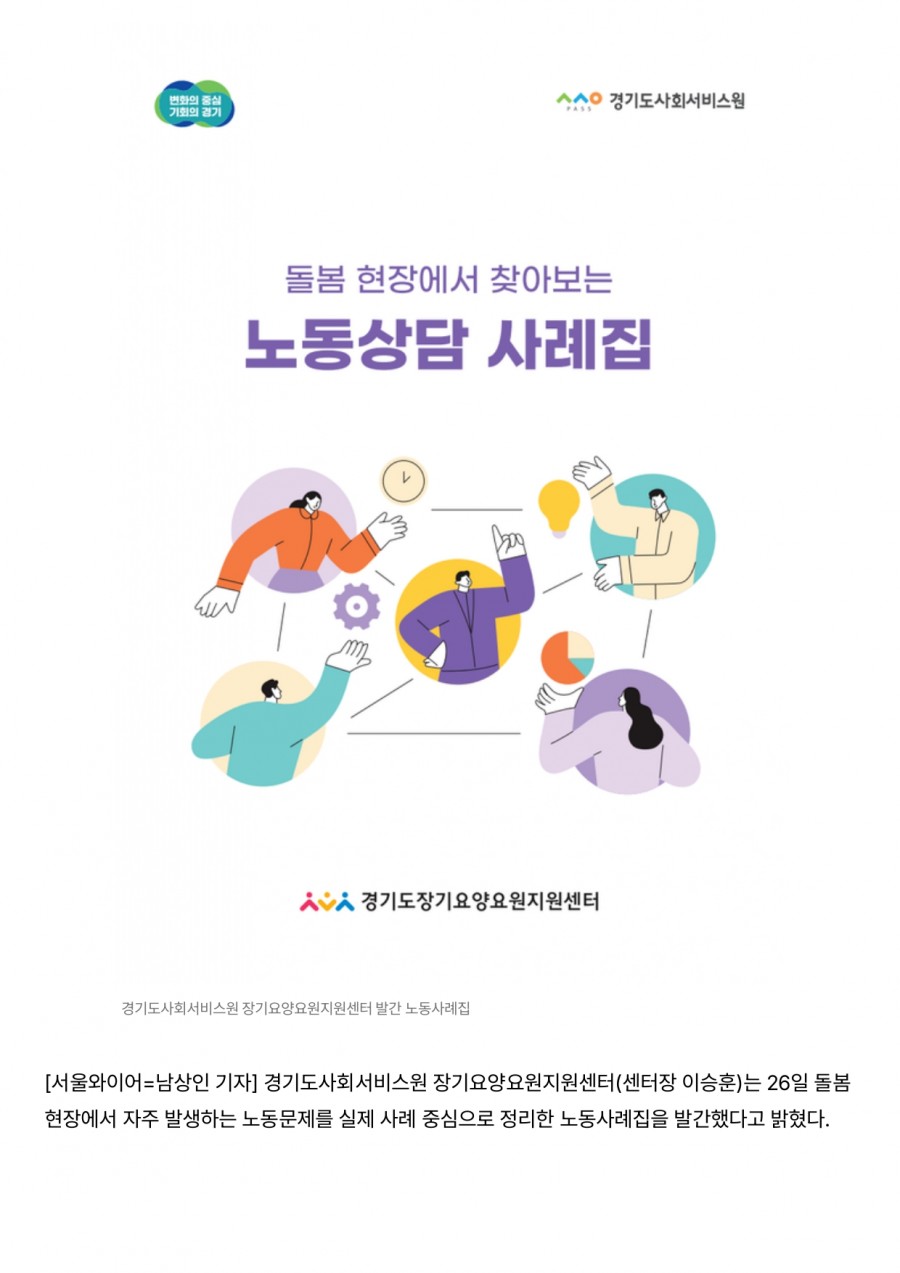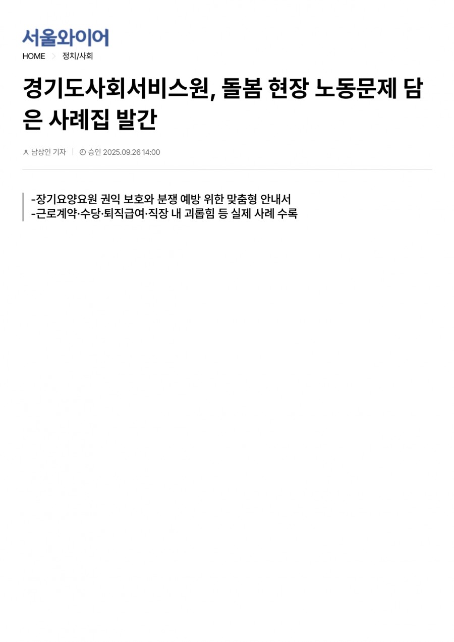 [서울와이어] 경기도사회서비스원, 돌봄 현장 노동문제 담은 사례집 발간 페이지 정보 작성자 센터관리자 조회 23회 작성일 2025-12-29 11:46 목록 본문 [서울와이어] 경기도사회서비스원, 돌봄 현장 노동문제 담은 사례집 발간 이전글[서울뉴스통신] “경사원 장기요양요원지원센터, ‘돌봄 현장에서 찾아보는 노동사례집’ 발간 장기요양요원의 권리 보호와 갈등 예방의 길잡이” 25.12.29 다음글[매일신문] 경기도사회서비스원, 돌봄노동 문제 담은 사례집 발간 25.12.29